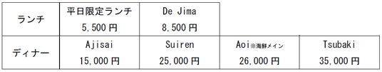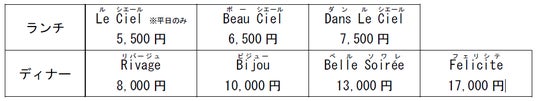 販売価格   各コースはランチ2種類、ディナー4種類をご用意しております。(おひとりさまあたり/税サ込)