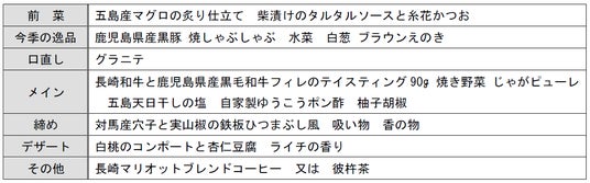 鉄板焼料理長 井上(いのうえ)康弘(やすひろ) コメント長崎の海と山の恵みに育まれた旬の食材と、今回は鹿児島県産黒毛和牛や黒豚を掛け合わせ同じ九州の豊かさを鉄板焼コースといたしました。地産地消を大切に素材本来の旨味を引き出し、鉄板焼ならではのライブ感とともに至福のひとときをお届けします。