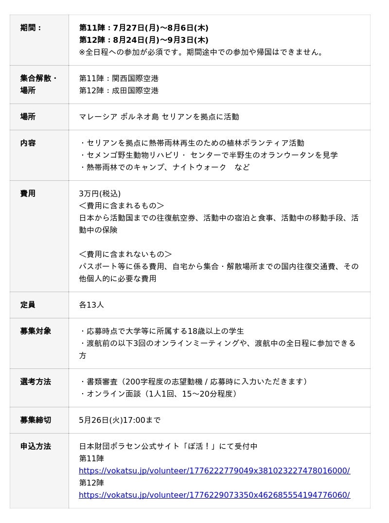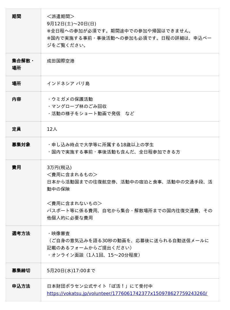 ・参加費3万円。日本から活動国までの往復航空券、現地宿泊、食事を提供