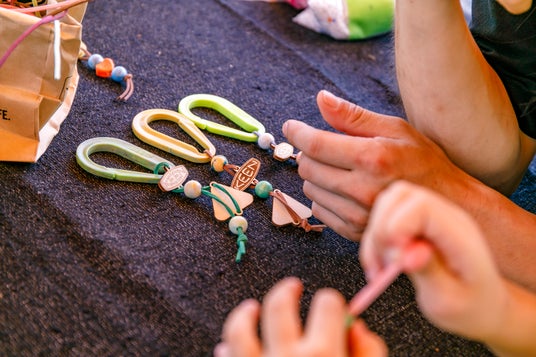 ペットボトルキャップや海洋ごみなどを再利用したカラフルなカラビナやビーズ、KEENロゴ、シューズパーツを自由に組み合わせて、オリジナルカラビナチャームを作れるワークショップ。
