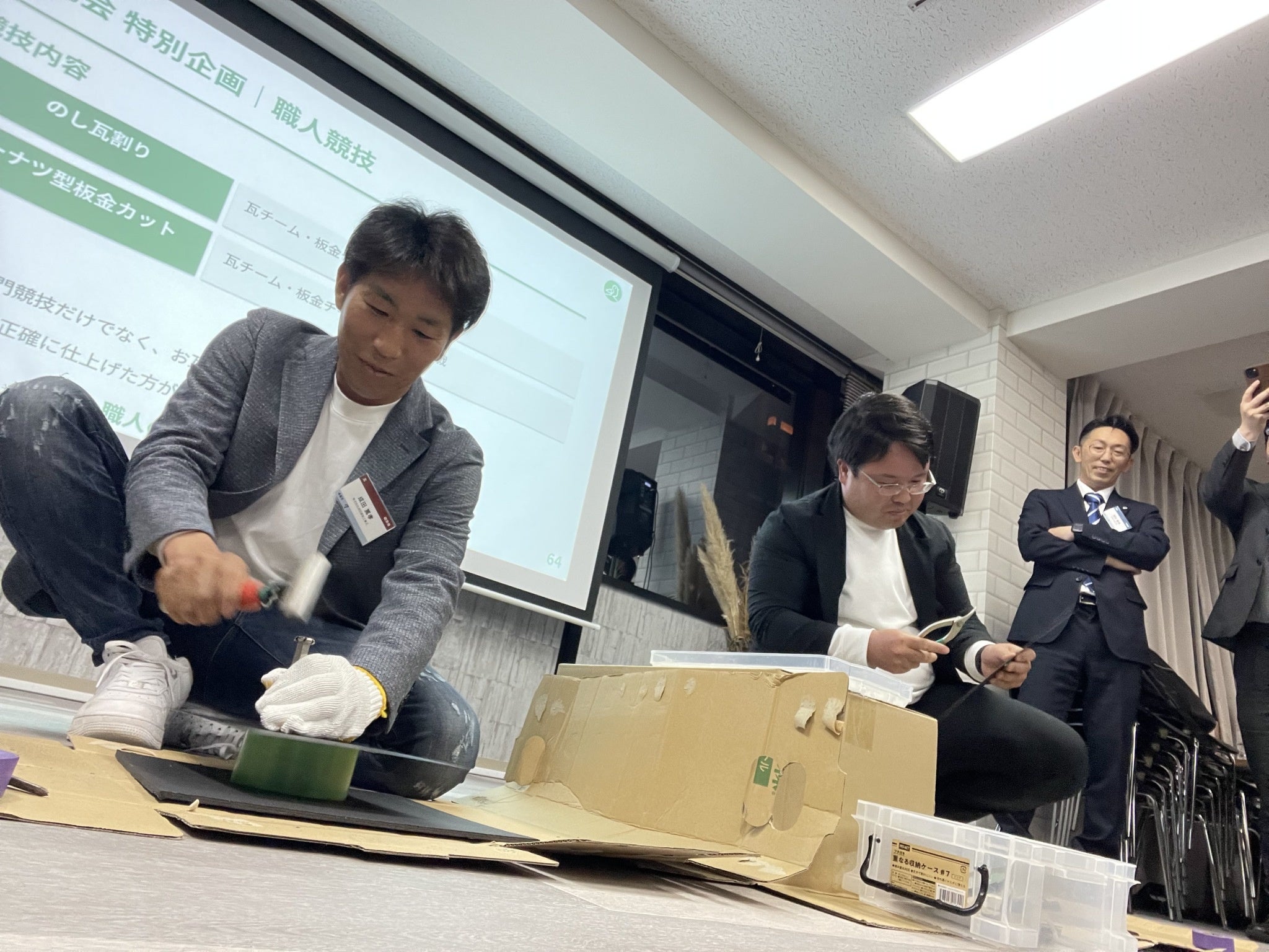 懇親会では「のし瓦割り」「板金カット」の職人競技も開催。瓦・板金それぞれの技能グランプリ・技能大会の優勝者が相手の競技にも挑戦し、会場は歓声に包まれました。