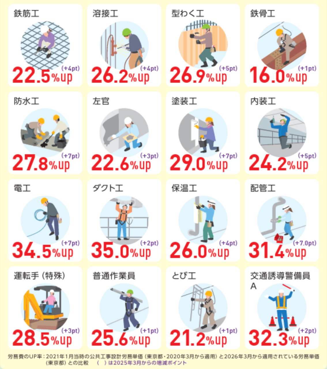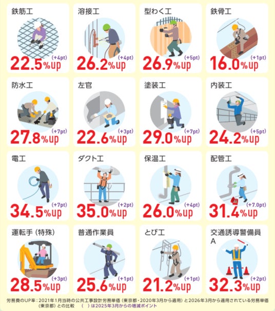 - 公共工事設計労務単価に至っては、2021年度からのわずか4年間で約23%上昇