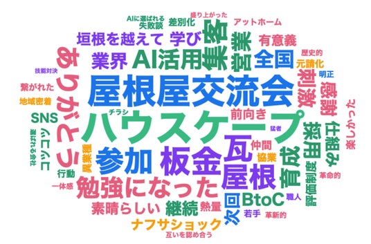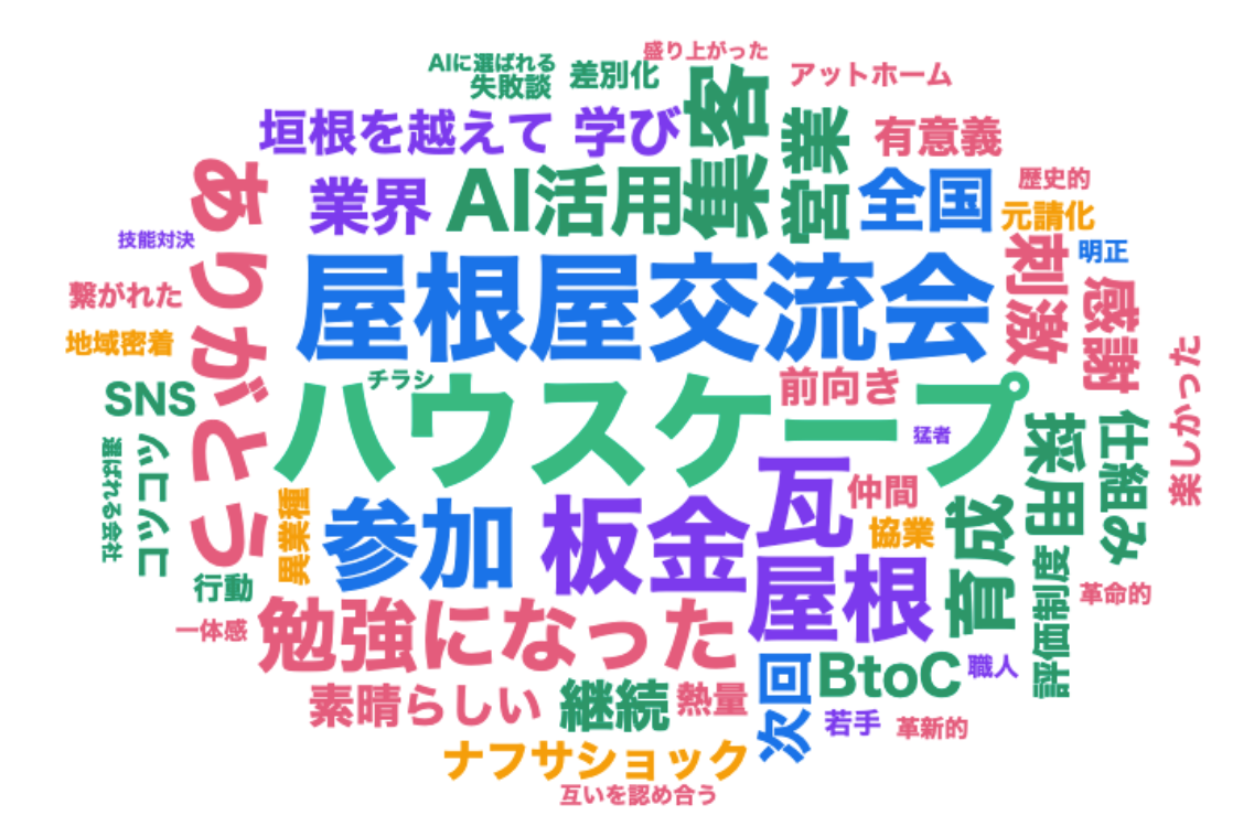 上記のワードクラウドは、アンケート自由記述欄に寄せられた感想・学び・メッセージから頻出語を視覚化したものです。「垣根を越えて」「歴史的」「一体感」「異業種」「協業」といった、瓦と板金の融合を象徴する言葉が並ぶ一方、「ナフサショック」「AI活用」「集客」「採用」「育成」「元請化」など、各社が自社に持ち帰った具体テーマも浮かび上がりました。主なテーマ別コメント抜粋は以下の通りです。