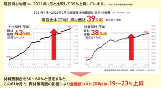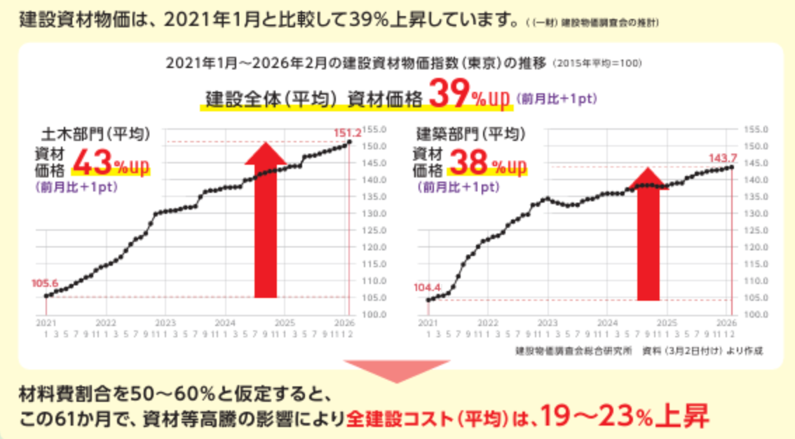 建設業全体の施工単価は、資材費と人件費の高騰を受けて上昇基調にあります。