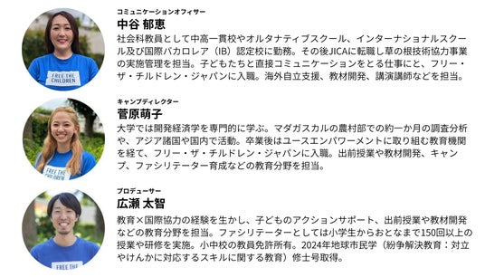 子どもの権利を軸に、貧困や搾取から子どもを解放することを目的に、クレイグ‧キールバ ーガー(当時12歳)が1995年にカナダで設立した「Free The Children」の理念に共感し、1999年 に日本で活動を開始。開発途上国での国際協力活動と並行して、日本の子どもや若者が国内外の問題に取り組み、変化を起こす「チェンジメーカー」になれるような子ども若者育成 事業を行う。教育機関などへの出前授業、講演‧教材販売、フェアトレード商品販売‧、国内外でのワークキャンプ活動、アドボカシー活動などを主な事業としており、活動内容は公 民‧英語教科書などの学校教材にも掲載される。こども家庭庁委託事業『ファシリテーター養成プログラム作成のための調査研究』(令和5 年度) にてこども‧若者の意見表明をサポートする「こども意見ファシリテーター」養成のためのモデルプログラムを株式会社NTTデータ経営研究所と共同開発。同プログラムのファシリテーターも務める。お問い合わせ