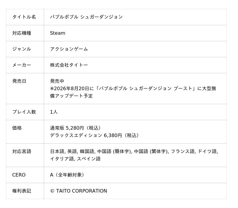 『バブルボブル シュガーダンジョン ブースト』公式サイト:https://www.taito.co.jp/BBSD