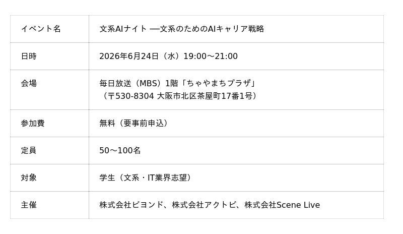 デジタル領域のプロフェッショナルとして、テクノロジーとデザインでクライアントのDX支援や経営課題の解決を行う株式会社アクトビ(本社:大阪府大阪市中央区、代表取締役社長 兼 CEO:藤原 良輔、東京証券取引所 TOKYO PRO Market 上場、証券コード:439A)は、関西のIT企業である、株式会社ビヨンド(本社:大阪市、代表取締役:原岡 昌寛)、株式会社Scene Live(本社:大阪市、代表取締役社長:磯村 亮典)とともに、2026年6月24日(水)、毎日放送(MBS)1階 ちゃやまちプラザ にて、文系大学生100名を対象としたキャリアイベント『文系AIナイト ──文系のためのAIキャリア戦略』を共同開催します。