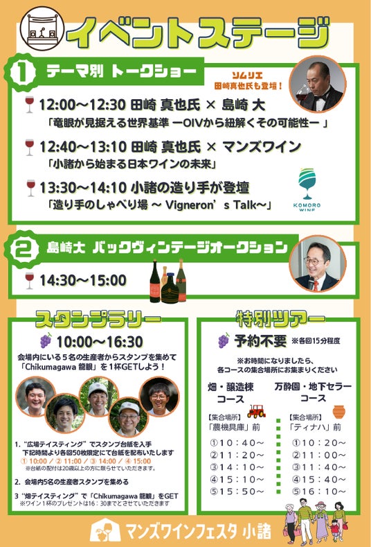 さらに、小諸市と共同開催する「KOMORO WINE DAYS 2026」も同時開催。地元食材を活かしたフードや地域の魅力が集まり、小諸の風土とワインを五感で楽しめる一日となります。