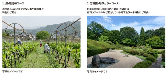 畑や醸造棟、ワイナリー内の庭園「万酔園」、地下セラーなど、通常は有料ツアーでご案内しているエリアを無料でご見学いただけます。1. 畑・醸造棟コース(各回15分程度)