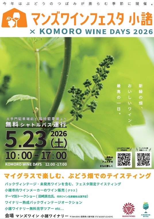 マンズワイン株式会社は、2026年5月23日(土)、長野県小諸市のマンズワイン小諸ワイナリーにて、「マンズワインフェスタ×KOMORO WINE DAYS 2026」を開催いたします。