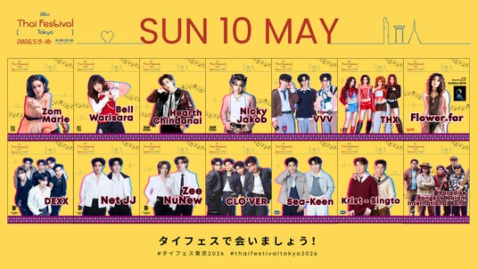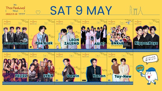 さらに代々木公園内で行われるタイフェスティバルに加え、5月5日(火・祝)から11日(月)まで代官山UNiT、渋谷eggman、ZEPP DIVERCITY TOKYO、北とぴあさくらホールで様々なファンミーティングや音楽ライブを多数開催!