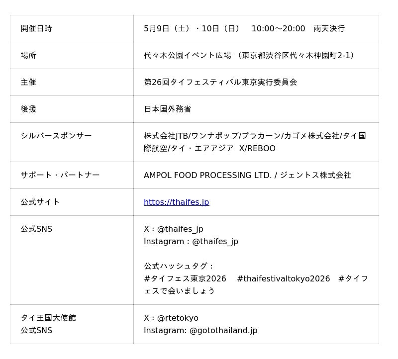 TSP太陽株式会社(本社:東京都目黒区、代表取締役社長 池澤嘉悟、以下「TSP太陽」)は、2026年5月9日(土)・10日(日)の2日間、東京都・代々木公園にて『第26回タイフェスティバル東京』を共催いたします。