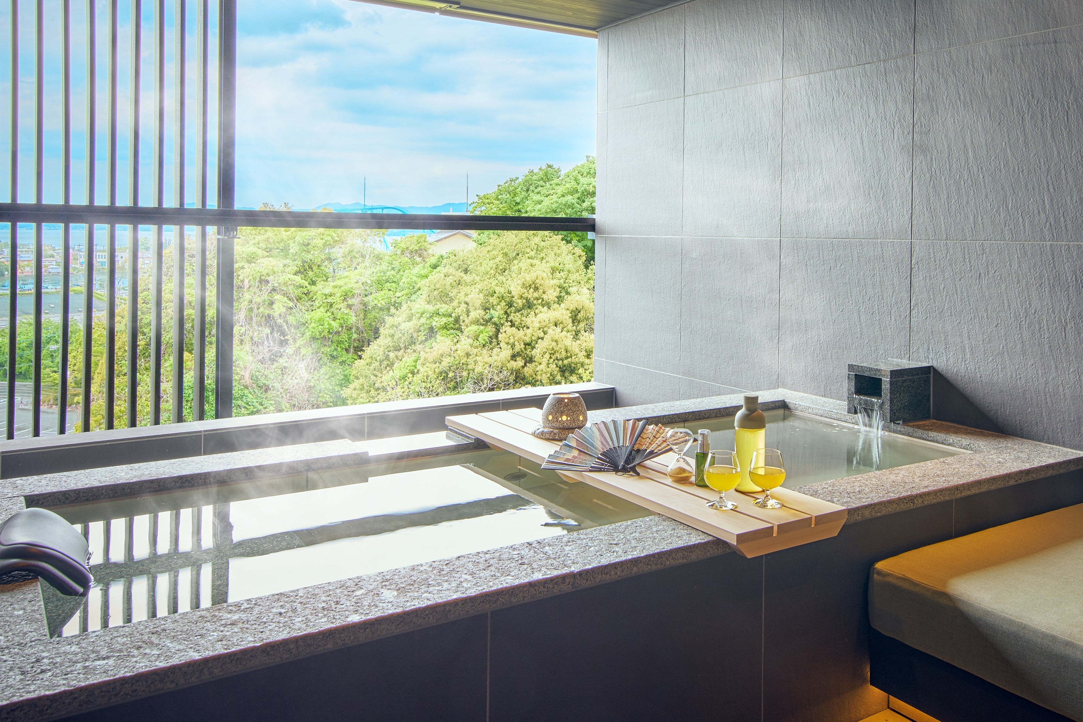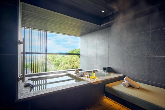 89平方メートル のゆとりある空間に露天風呂を完備した、当館最大の広さの客室です。リビングルームにはくつろぎを追求したソファを配置。10種類の茶葉と5種類の茶器から自分に合ったお茶を選ぶ煎茶体験「私だけの一杯」を、滞在中好きな時に好きなだけ楽しめます。また、露天風呂では温泉につかりながらお茶を楽しめるグッズを用意。誰にも邪魔されない空間で、煎茶と温泉に心ゆくまで没入できます。