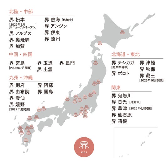 「界」は星野リゾートが全国に23施設を展開する温泉旅館ブランドです。「王道なのに、あたらしい。」をテーマに、その地域の伝統文化や工芸を体験する「ご当地楽」や、地域の文化に触れる客室「ご当地部屋」などを通じて、その地の「温泉文化」が楽しめるのが特徴です。2026年には「界 草津」(群馬県‧草津温泉)、「界 宮島」(広島県‧宮島口温泉)、「界 蔵王」(山形県‧蔵王温泉)の3施設の開業、「界 松本」(長野県‧浅間温泉)のリニューアルオープン、2027年には「界 嬉野」(佐賀県‧嬉野温泉)の開業を予定しています。