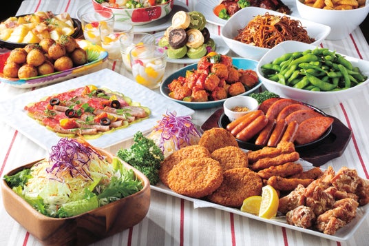 サラダ&タコスバー、ジャーマンポテト、フィシュ&チップス、ムール貝のガーリックバター、ミックスピザ、焼きそば、たこやき、若鶏のからあげ など