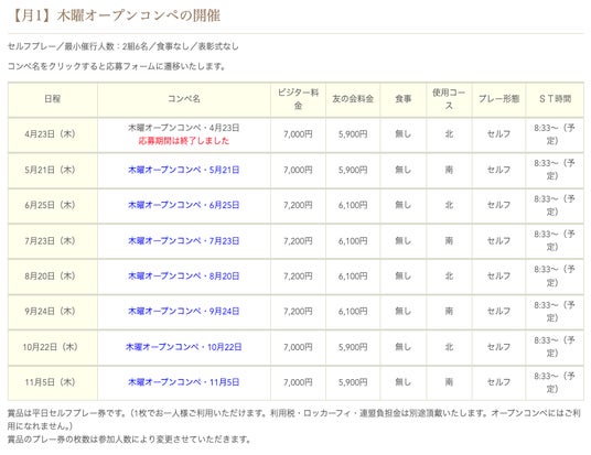 コース、スタート時間は変更になる場合がございます。ご了承下さいませ。 スタート時間はコンペ日の2日前までに組合せを決定しますので、お電話にてお問い合わせください。