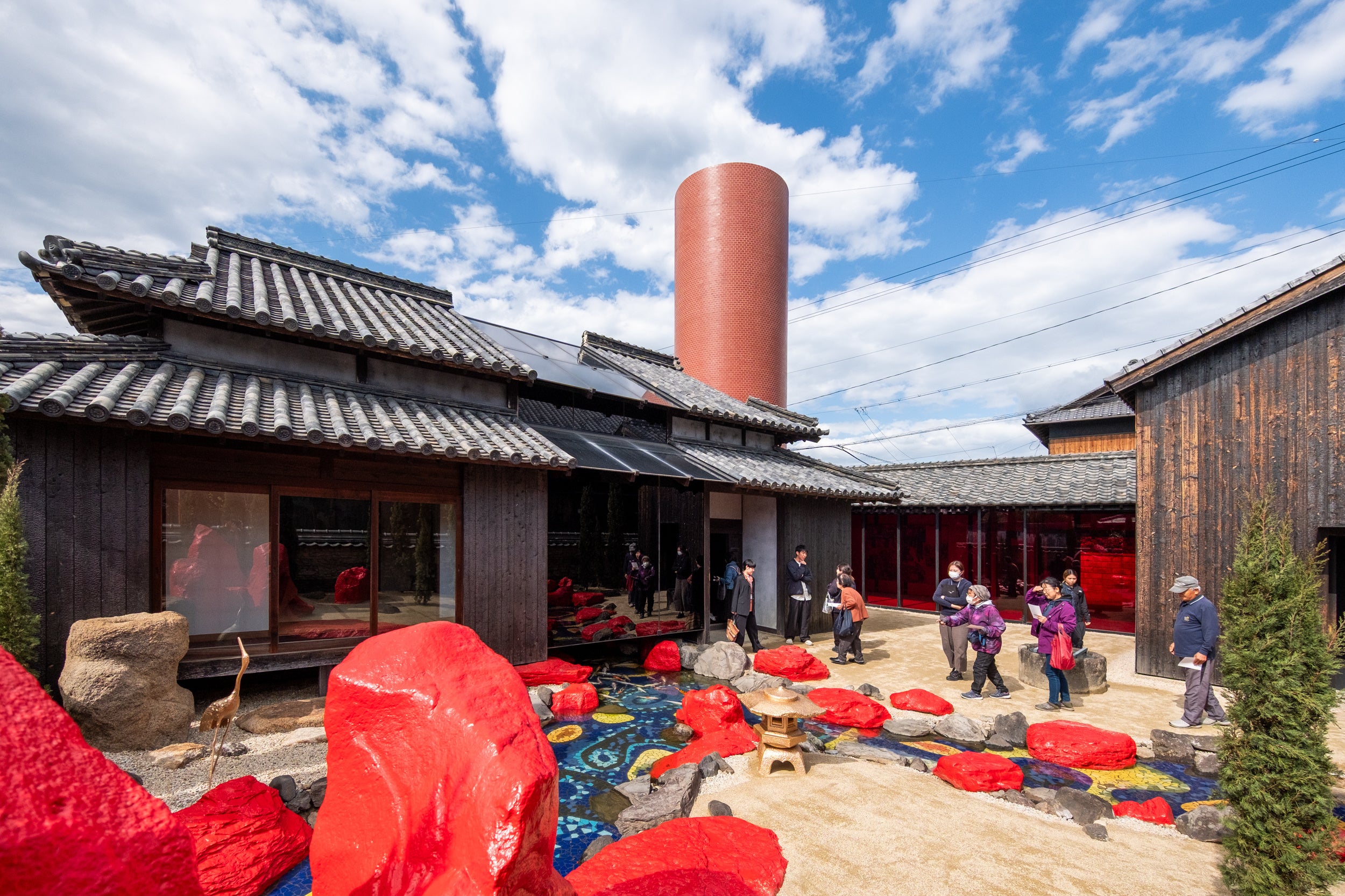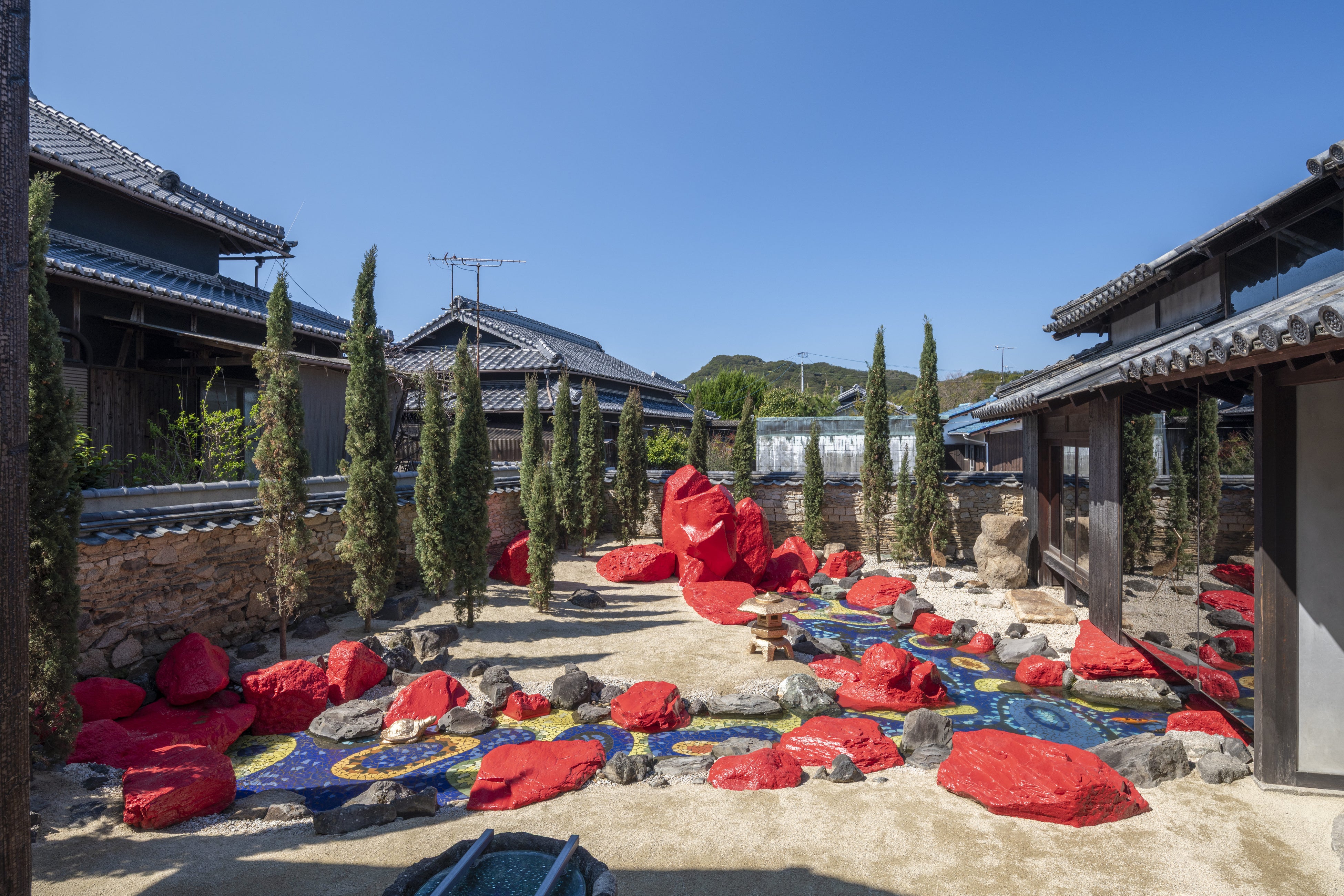アーティスト・横尾忠則が全体コンセプトを手掛けた「豊島横尾館」は、豊島の玄関口となる港に面した家浦地区の、集落にある古い民家を改修してつくられました。展示空間は、既存の建物の配置を生かして「母屋」「倉」「納屋」で構成され、平面作品11点を展示しています。また、石庭と池、円筒状の塔にはインスタレーションが展開され、作品空間は敷地全域にシンボリックな拡がりをみせます。その空間は、生と死を同時に想起させる哲学的な場となり、さらに、建物には光や色をコントロールする色ガラスを用いて、豊島の光や風や色、作品の見え方をさまざまに変容させて、空間体験をコラージュのようにつなげます。■豊島横尾館 施設情報