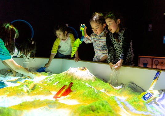 プロジェクションマッピングやAR(拡張現実)の技術を活用することで、砂の形状に合わせて、本物の大地のように山や海、生きものなどが出現する 「みらいの砂場」。