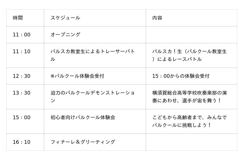 本イベントでは、国内トップレベルのパルクールアスリートが横須賀総合高校吹奏楽部の演奏にあわせてパフォーマンスをする迫力満点のデモンストレーションをはじめ、こどもから高齢者まで幅広い世代の方々が障害物のあるコースを身体能力だけで通り抜けるパルクールを楽しめる体験会を実施。