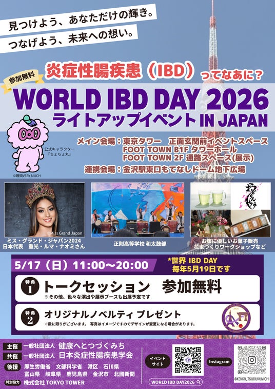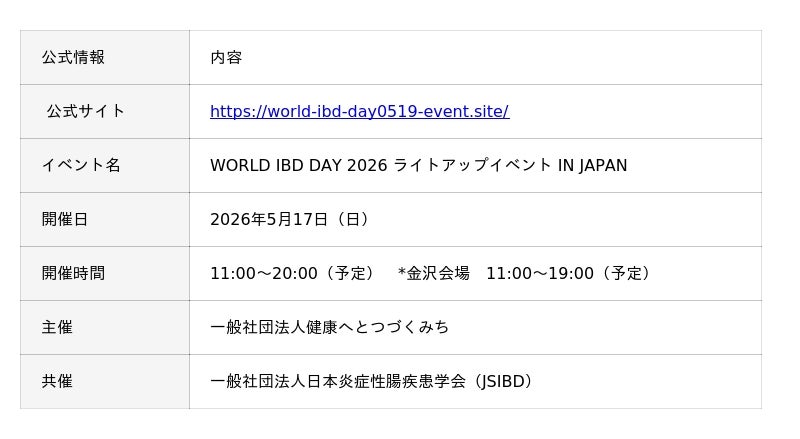 一般社団法人健康へとつづくみち(代表理事:小柴大世)は、2026年5月17日(日)、炎症性腸疾患(IBD)への理解促進を目的とした啓発イベント「WORLD IBD DAY 2026 ライトアップイベント IN JAPAN」を開催いたします。共催は一般社団法人日本炎症性腸疾患学会(JSIBD)、後援は厚生労働省、文部科学省、石川県、富山県、岐阜県、鹿児島県、港区、金沢市、北國新聞です。