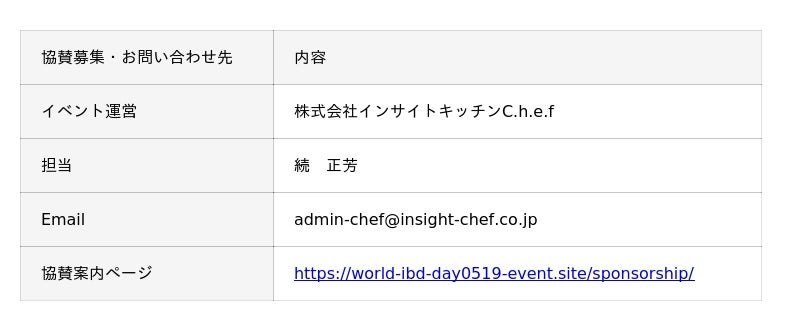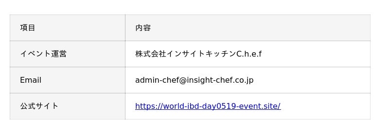 なお、本プロジェクトでは、IBD啓発の輪をさらに広げていくため、引き続き協賛・ご支援をいただける企業・団体・個人の皆さまを募集しております。協賛内容の詳細や趣意書の送付をご希望の方は、協賛案内ページ(https://world-ibd-day0519-event.site/sponsorship/ )をご確認のうえ、下記までお問い合わせください。